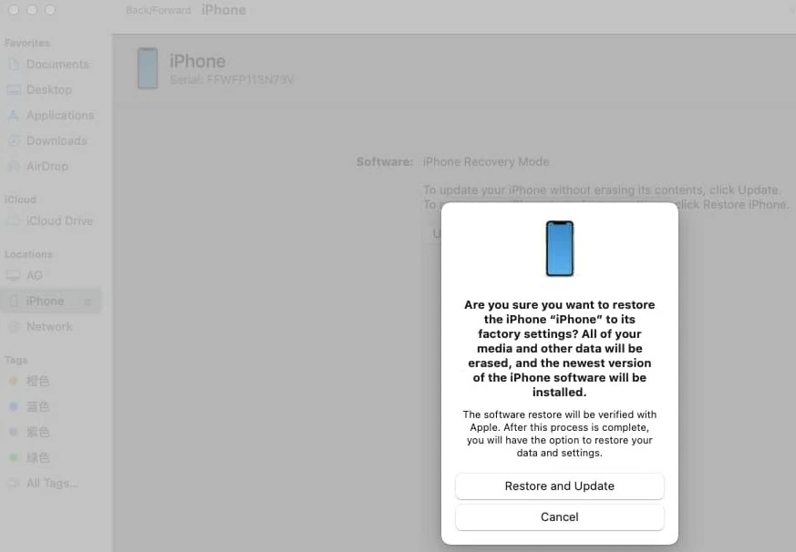 5。在此阶段,iTunes或Finder应该打开,并为您提供更新或还原iPhone的选项。选择恢复。