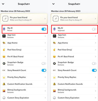 - 访问 Snapchat Plus 的设置并找到“我的 AI”选项。在这里,您应该会看到一个选项,用于从源顶部取消固定或删除“我的 AI”聊天。