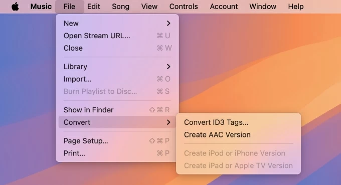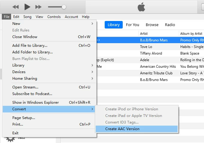 4. 选择剪辑后,转到文件>转变>创建AAC版本。 AAC 格式的歌曲副本将出现在您的音乐列表中,通常位于原始曲目的上方或下方。