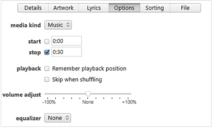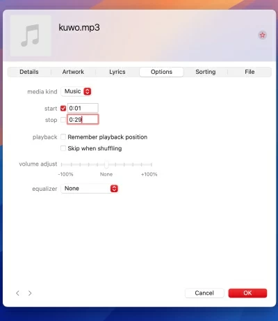 3. 右键单击歌曲>获取信息> 根据选项选项卡,设置 30 秒开始和停止时间,然后单击好的。