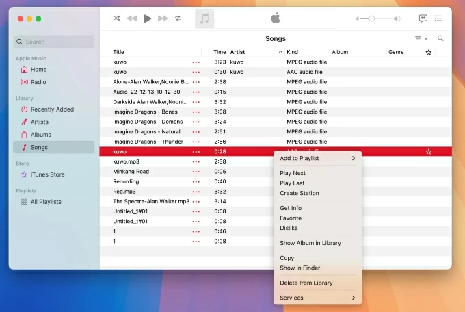5. 右键单击“音乐”中的新文件 >在 Finder 中显示。