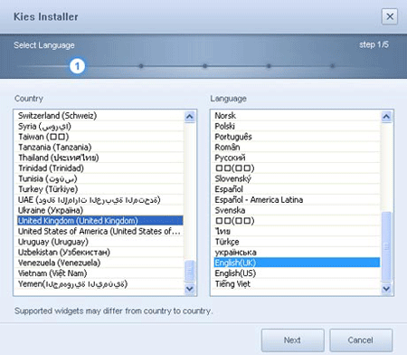 2. 按照说明操作,您可能需要选择国家和语言,如图所示。单击下一步按钮。