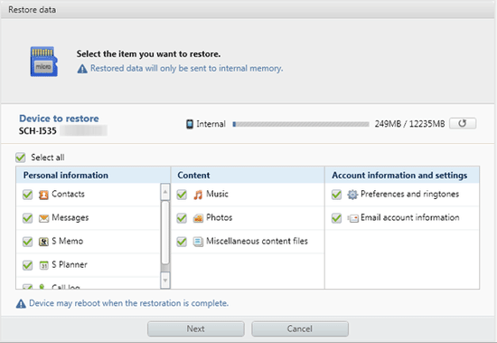 3.选择要恢复的项目,然后单击“下一步”按钮。然后恢复的数据将被发送到内部存储器。