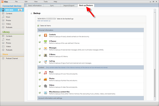 第三步。单击“备份/恢复”按钮,然后选择要传输的文件,向下滚动页面以找到“备份”按钮并点击它。