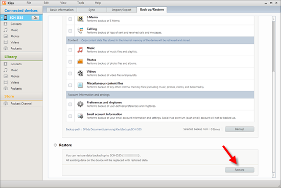1.将三星连接到您的计算机,然后按照上一个教程中的步骤进行操作。将“备份/恢复”页面向下滚动至底部,然后单击“恢复”按钮。
