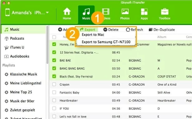 现在,选择要传输到索尼手机的歌曲(假设您将其设置为目标设备)。您可以选择完整的播放列表、所有音乐文件或单首歌曲。