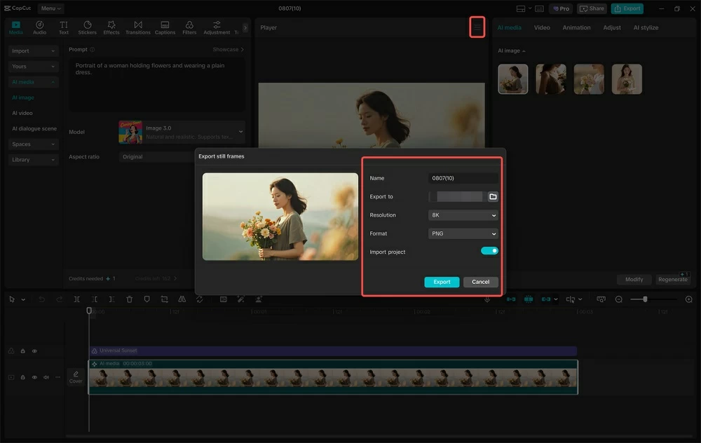 CapCut PC 视频编辑器通过其 AI 功能提供了一种用户友好的方式来创建此类填充镜头。有了它,您可以创建库存风格的图像,这些图像可以在编辑中用作额外的视觉效果。