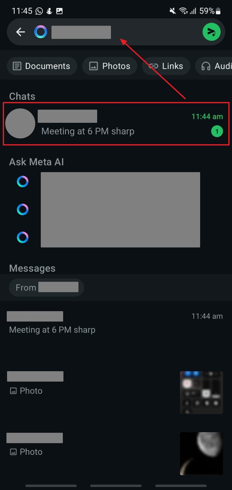 指示:在 Android 操作系统设备的 WhatsApp 主界面中,在“搜索栏”上输入此人的姓名。然后,无需打开聊天即可从搜索结果中阅读消息。