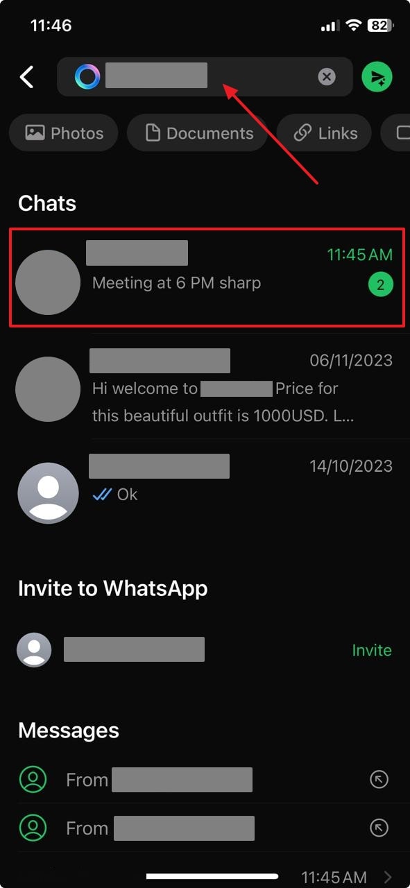 一个不太常见但有用的技巧是使用 WhatsApp 的搜索栏来预览消息。通过在搜索栏中输入联系人姓名,您可以在搜索结果中看到他们最近的消息片段。此方法非常适合在不打开聊天的情况下快速查看消息。继续,阅读下面的指南,了解如何在没有蓝色勾号的情况下查看 WhatsApp 消息: