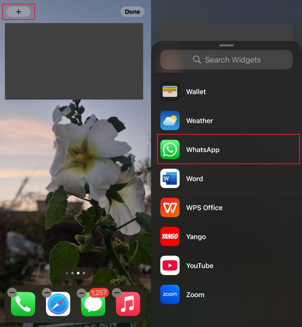 步骤1首先点击并按住 Apple 手机上的主屏幕,然后按左上角的“+”按钮添加“小部件”。然后,选择“WhatsApp”作为要添加到屏幕的选项。