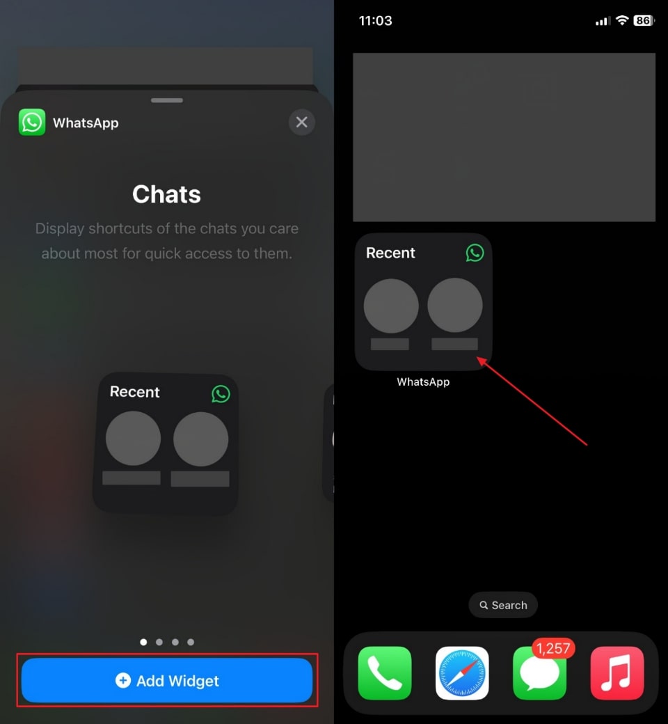 通过将小部件添加到主屏幕,您可以实时查看所有传入消息。这种方法不仅谨慎,而且易于使用,可以随时了解对话的最新情况。它提供了一种无需打开应用程序即可阅读特定聊天消息的便捷方法。按照以下步骤,您可以学习如何在不双击的情况下阅读 WhatsApp 消息: