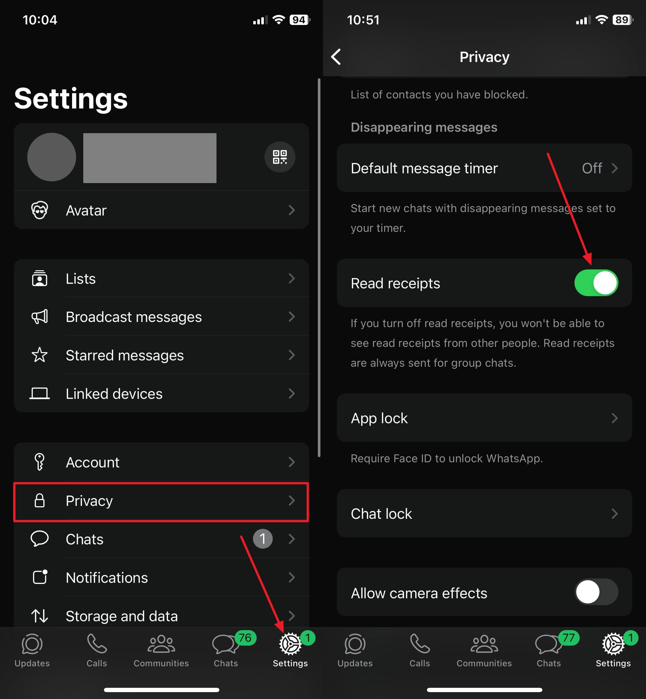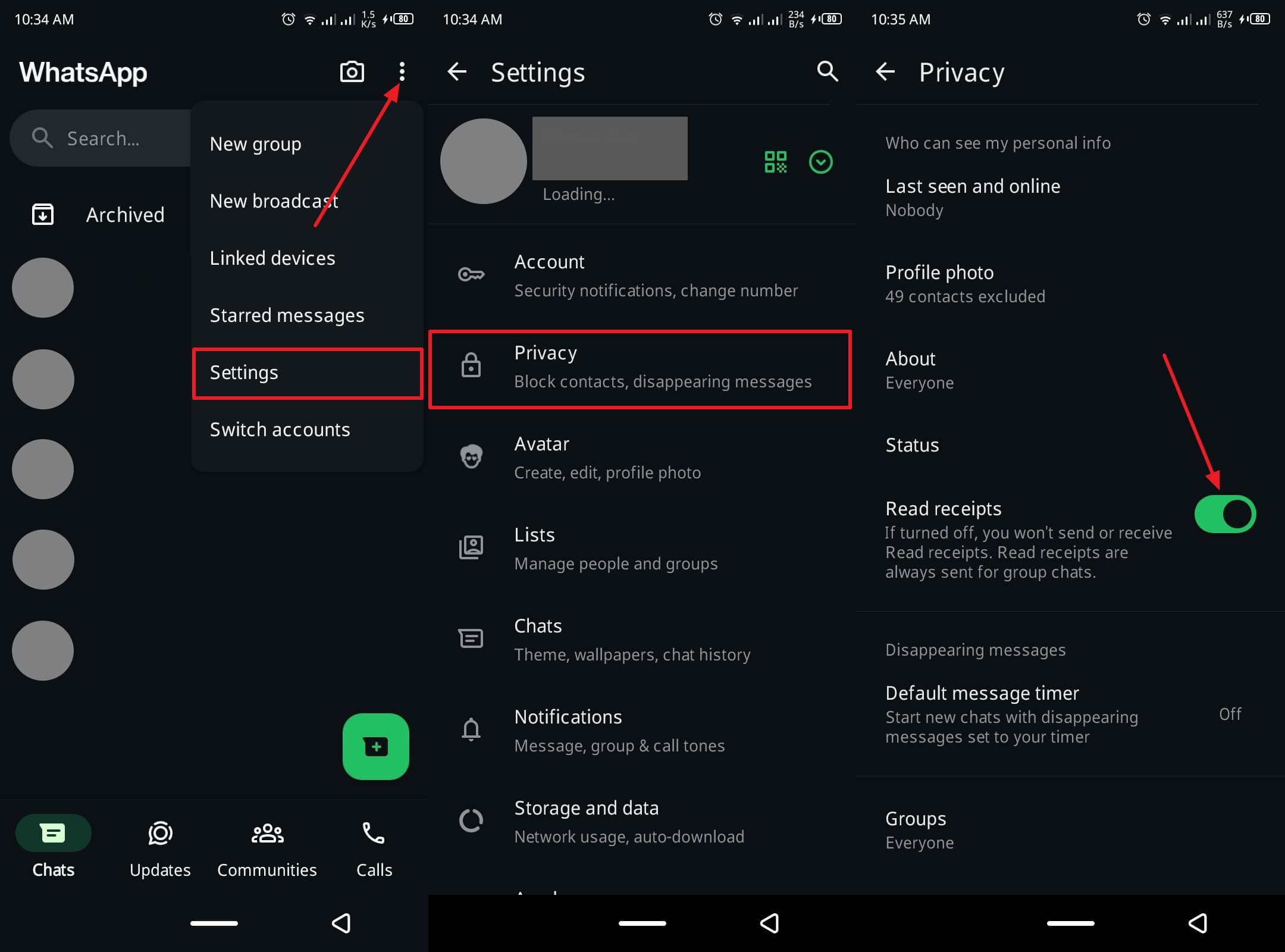 指示:在应用程序的主界面中,点击屏幕右上角的“垂直三点”以选择“设置”选项。然后,在“设置”面板中,选择“隐私”选项卡,然后按绿色的“已读收据”开关将其禁用。