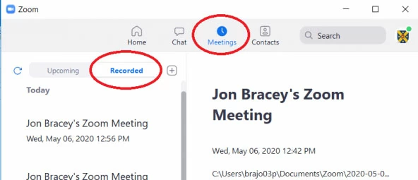5. 默认情况下,您的录音存储在飞涨文件夹中的子文件夹名为文档。访问录制文件的另一种方法是会议>已录制选项卡,然后选择包含您的录音的 Zoom 会议。