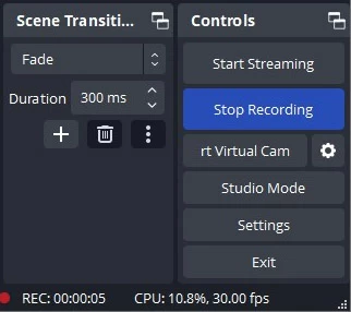 要让 OBS 停止录制,请返回其主窗口并点击“控制”窗格中的“停止录制”按钮。