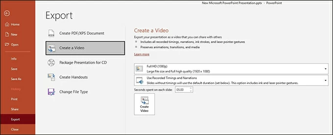 当您完成 PowerPoint 演示文稿并且对录制的视频和音频感到满意时,您可以将 PowerPoint 演示文稿转换为视频并将其保存在计算机上。按照以下步骤在 Mac 或 Windows PC 上制作带音频的 PowerPoint 演示视频录制。