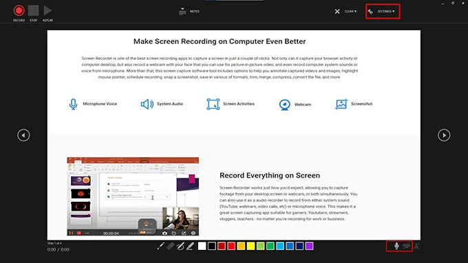 要在演示过程中捕获旁白,您需要打开麦克风选项。如果您处于录音模式,您可以在右下角找到麦克风图标以确保其处于活动状态。如果您有多个音频设备可供选择,请前往录音屏幕左上角的“设置”并调整您的音频设备。