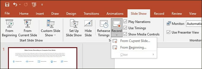 步骤2。点击录制幻灯片根据幻灯片放映盒子。将给出两个选项:“从头开始记录”和“从当前幻灯片开始记录”。