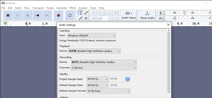 然后打开Audacity,点击“音频设置”>“主机”,选择“Windows WASAPI”来录制系统声音。然后在“录制设备”部分中选择您的输出设备,然后单击“录制”图标开始录制。