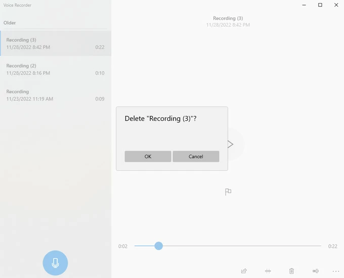 1。打开语音录音机后,查找并选择要从左板列表中删除的音频文件。
