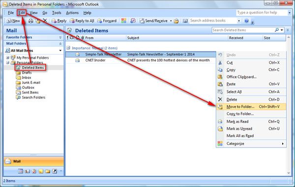步骤1。单击位于主“电子邮件文件夹”列表下的“已删除项目”按钮。