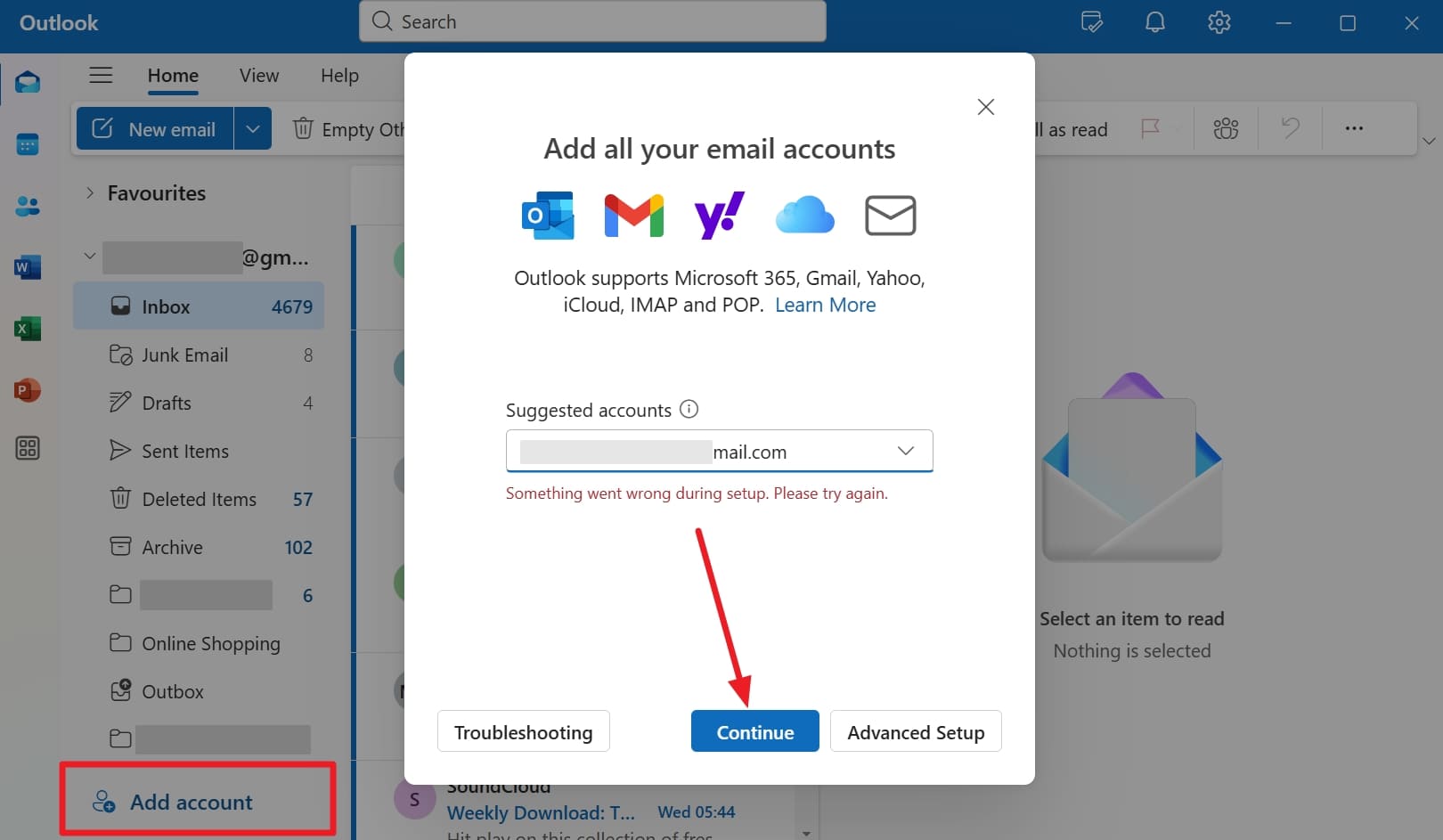 步骤3最后,再次使用“继续”按钮,让系统同步您的 Outlook 收件箱中的 AOL 电子邮件。