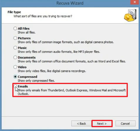 步骤1通过在 PC 上安装 Recuva 来启动该过程,选择“电子邮件”选项,然后单击“下一步”按钮。