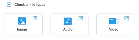 从那里,您需要指定您要恢复的文件类型。例如,如果您正在搜索一些误删除的视频,请选中“视频”右上角的框。您可以一次选择多种文件类型。