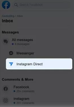 - 导航到您的Facebook收件箱,然后单击位于左侧的“ Instagram Direct”图标。您删除的Instagram消息应在此处访问。