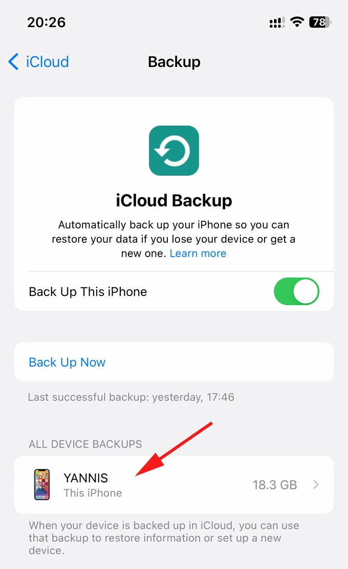 如果您定期将 iPhone 15 备份到 iCloud,或者启用了 iCloud 备份来自动备份设备,则备份很有可能保留您所需的丢失消息。要恢复 iPhone 15 上的所有短信,您只需从 iCloud 备份恢复设备即可。
