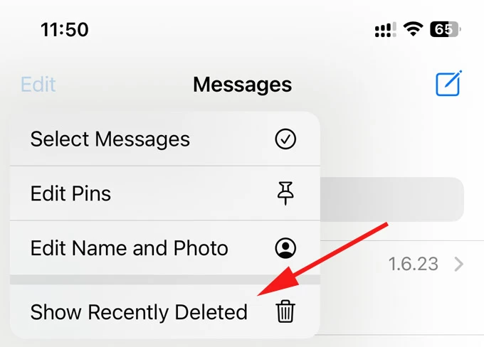 2. 点击编辑>显示最近删除的内容。或者点击过滤器>显示最近删除的内容。您可以在消息对话屏幕的右上角找到这些选项。