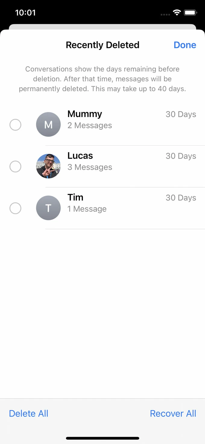 如果您删除了对话或消息,首先要查看的位置是“最近删除”文件夹。您可能会看到等待检索的已删除消息线程的列表。
