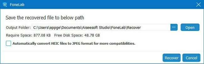 单击恢复底部的按钮并选择输出文件夹;那么丢失的 iPhone 照片将立即恢复,无需备份。您可以选择将 HEIC 图片转换为 JPEG 格式以获得更好的兼容性。