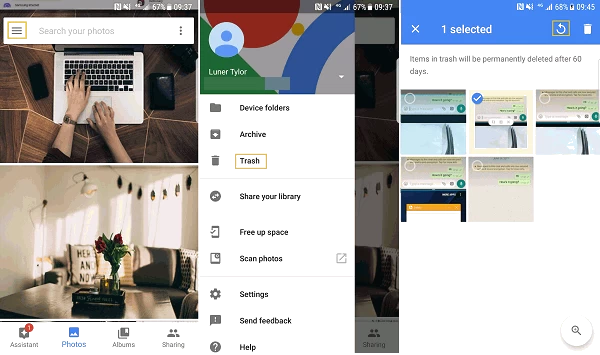 由于自动同步功能,您在 Android 上的 Google 相册中备份的那些已删除的图像和视频将被转移到垃圾箱文件夹,并会在那里保留 60 天。选择您要恢复的文件,然后点击“恢复”按钮。