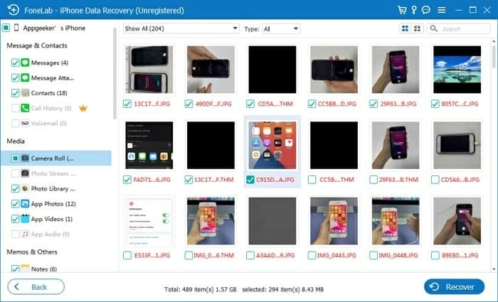 当它完成扫描 iPhone 12 后,您就可以查看结果。转到左侧边栏的媒体部分,单击“相机胶卷”、“照片库”、“照片流”类别以查看找到的文件。要快速找到已删除的图片,您需要从照片列表上方的下拉框中选择“仅显示已删除的文件”过滤器。