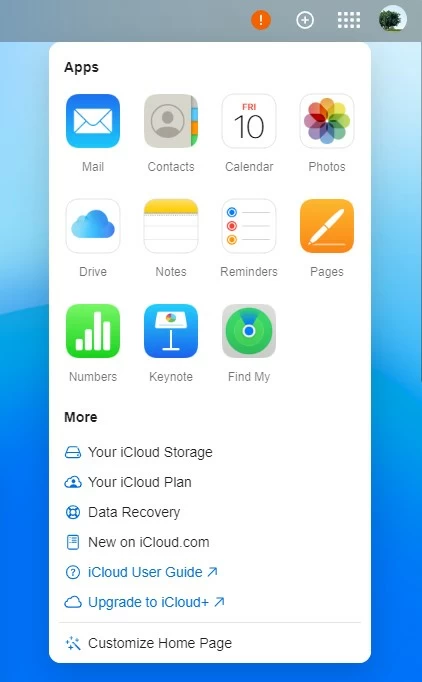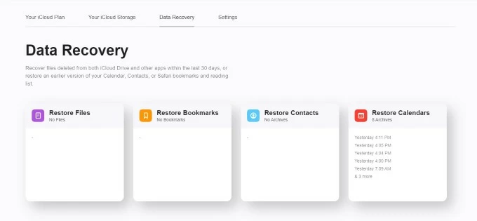 3. 选择“恢复日历和提醒”。在新的 iCloud 界面中,该选项已被“恢复日历”取代,点击该选项即可查看恢复日历和提醒信息。