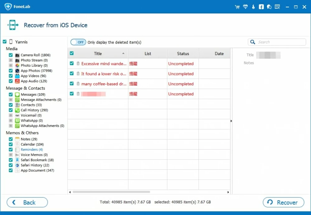 您可以在右侧面板中预览已删除的提醒。要从 iPhone 取回提醒,只需选中您想要的每个项目旁边的复选框,然后单击“恢复”按钮即可将提醒保存到计算机上。