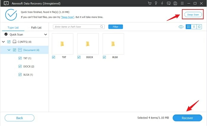 除了快速扫描,另一个强大的深度扫描还可以帮助您找到计算机中所有已删除的文件。只需单击深度扫描右上角的按钮。这将对驱动器执行全面扫描并找到更多被班次删除的文件。
