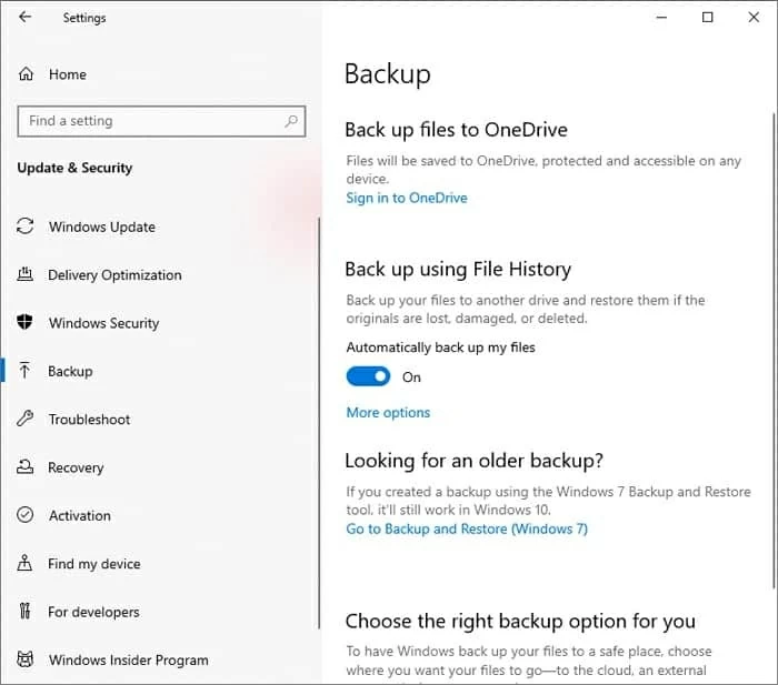 - 在下面使用文件历史记录进行备份,确保将其打开。