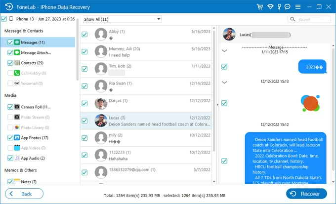 步骤 4. 预览文本或 iMessage,然后选择要恢复的文本或 iMessage。