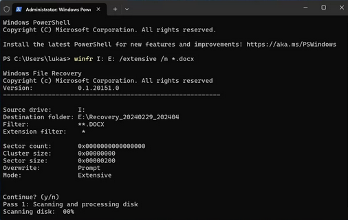 - 要恢复照片,请使用:winfr I: E: /extense /n *.jpg。 (您现在可以将 .jpg 更改为 .jepg、.png 等)