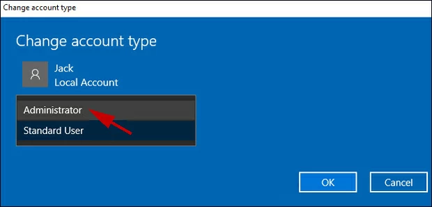 - 接下来,返回帐户窗格,单击您刚刚创建的管理员帐户,然后选择更改帐户类型。