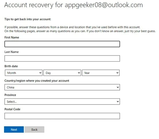 输入发送到您的备用电子邮件地址的代码后,单击“验证”。系统会要求您提供更多信息,例如您的出生日期、姓名、位置、Microsoft 产品体验、以前的密码