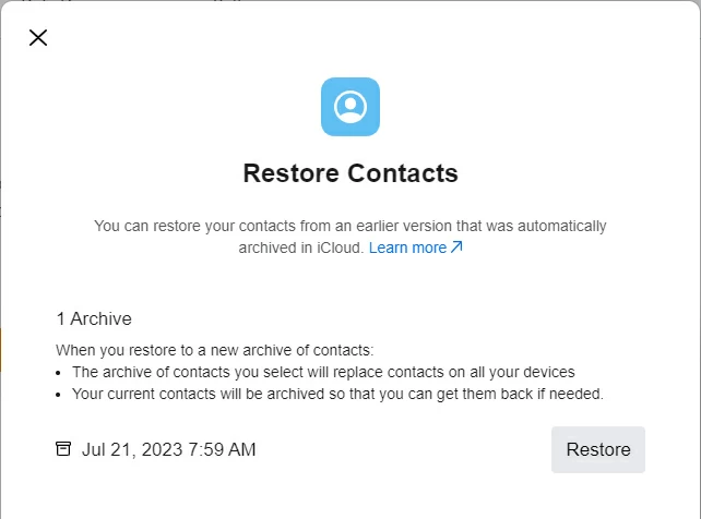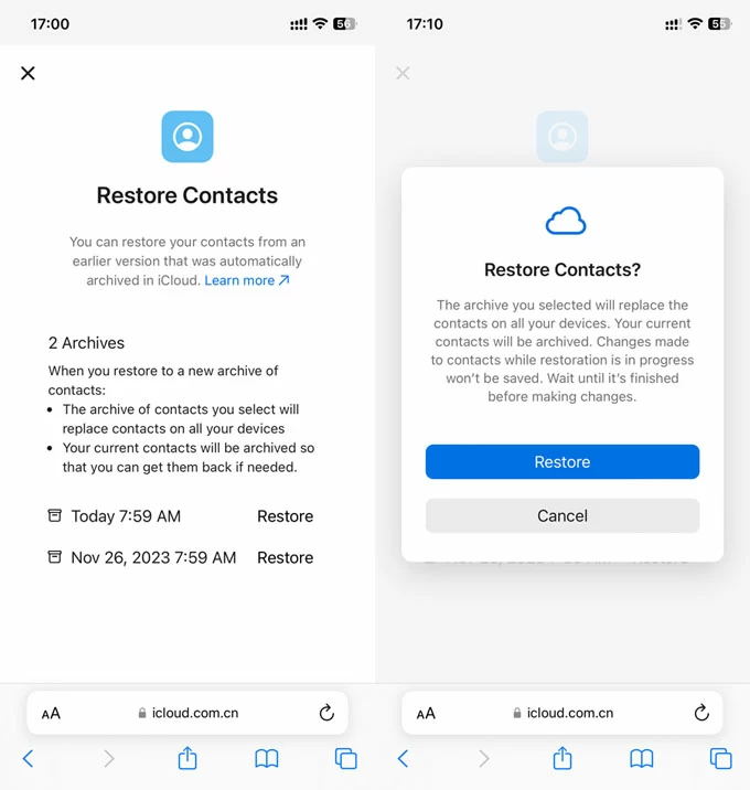 6. 当询问是否恢复联系人?时,点击蓝色恢复按钮来恢复已删除的联系人。当 iCloud 恢复所有联系人后,您会发现旧的已删除联系人重新出现在您的手机上。如果没有,您选择的联系人的存档版本不包括最近删除的 iPhone 15 联系人。