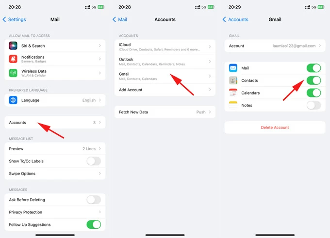 2. 如果手机上消失的联系人与 Gmail 等电子邮件帐户绑定,则可以通过“设置”>“邮件”>“帐户”>“Gmail”恢复联系人,并启用“通讯录”以将联系人同步到 iPhone 15。