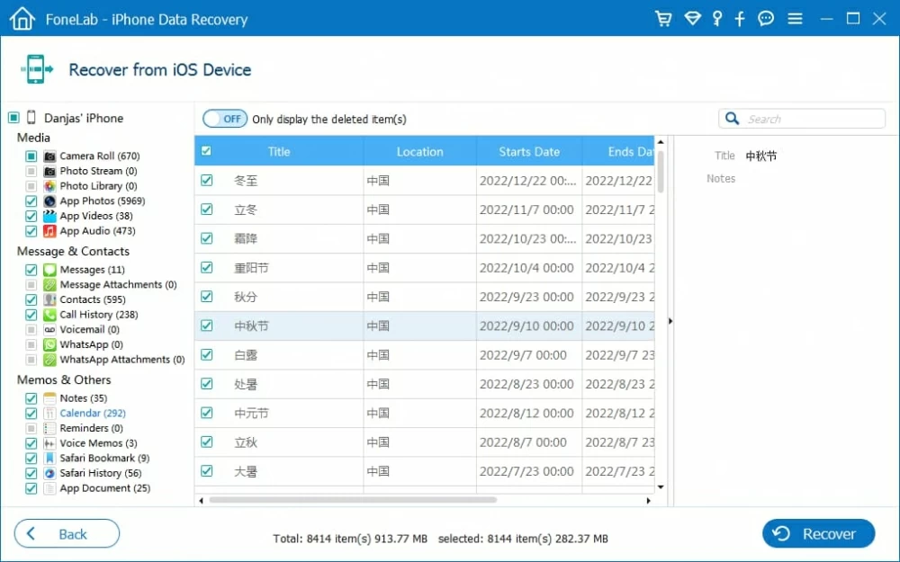 扫描完成后,您应该看到这个界面:找到的日历被分组到“备忘录和其他”部分下名为“日历”的类别中。