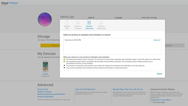现在,单击“日历”并选择您想要从 iPad 中恢复的日历,然后单击“恢复”按钮即可检索日历中的重要事件。
