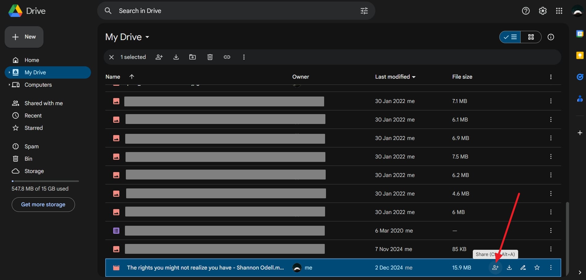 步骤1首先,在任何浏览器上使用您的Google Drive帐户登录,单击“+新建”按钮,然后按“文件上传”上传所需的大视频。添加后,单击视频文件上的“共享”图标以访问一个小对话框。
