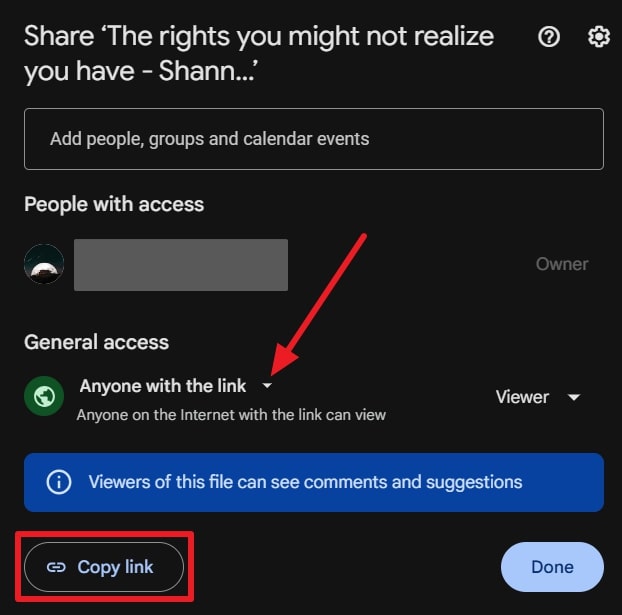 步骤2现在,将“常规访问”选项卡的设置更改为“知道链接的任何人”选项。之后,点击“复制链接”选项并前往手机或桌面上的 WhatsApp 应用程序。