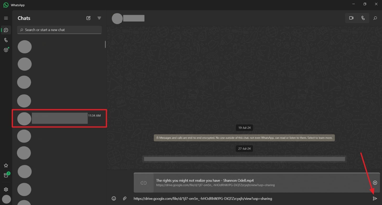 步骤3当消息应用程序打开时,前往所需的聊天并在“键入消息”框中按键盘上的“Ctrl + V”键。然后,当链接粘贴到消息框中时,点击“发送”图标即可通过链接分享大视频。