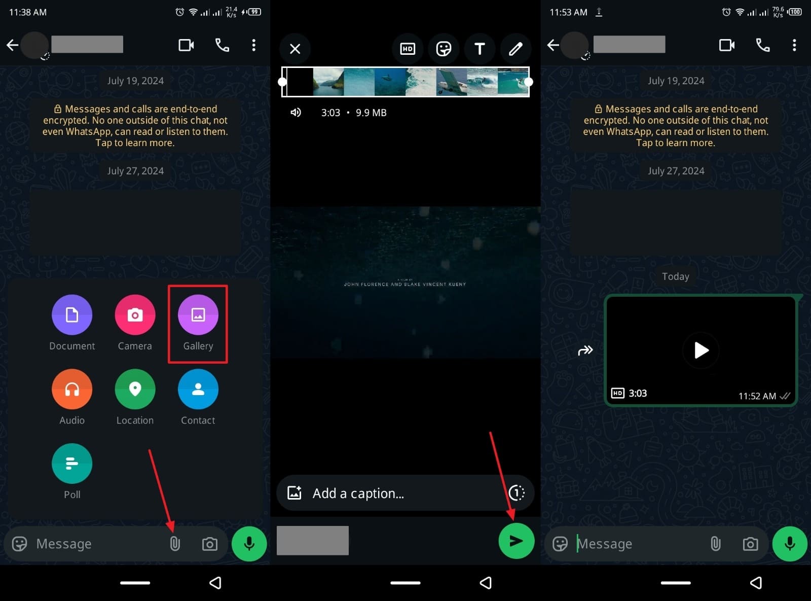 步骤2视频压缩后,前往手机或电脑上的 WhatsApp 聊天,然后点击“附件”图标打开自下而上的菜单。从这里,选择“图库”选项,选择压缩视频,然后点击“发送”图标即可成功发送。